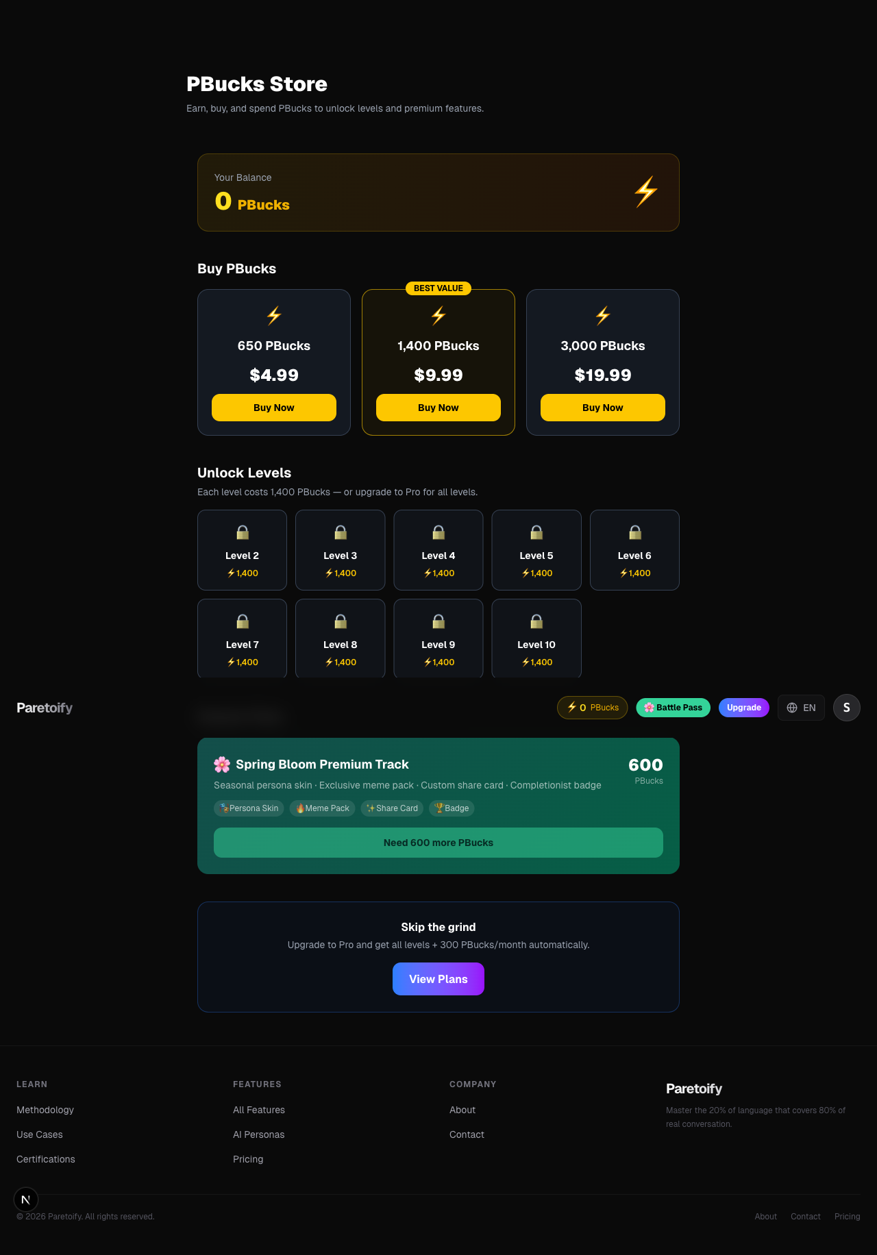 Earn currency from learning. Spend it to unlock levels, season passes, and cosmetics.